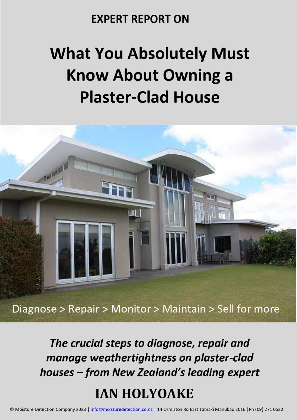 In this report, industry expert, Ian Holyoake, a former plaster cladding manufacturer, and now MD of Moisture Detection Company, clearly explains the dilemma facing the sellers (and buyers), You will discover how the leaky home fiasco came to pass, how to prepare your house for sale, and prove to buyers that your house is sound.